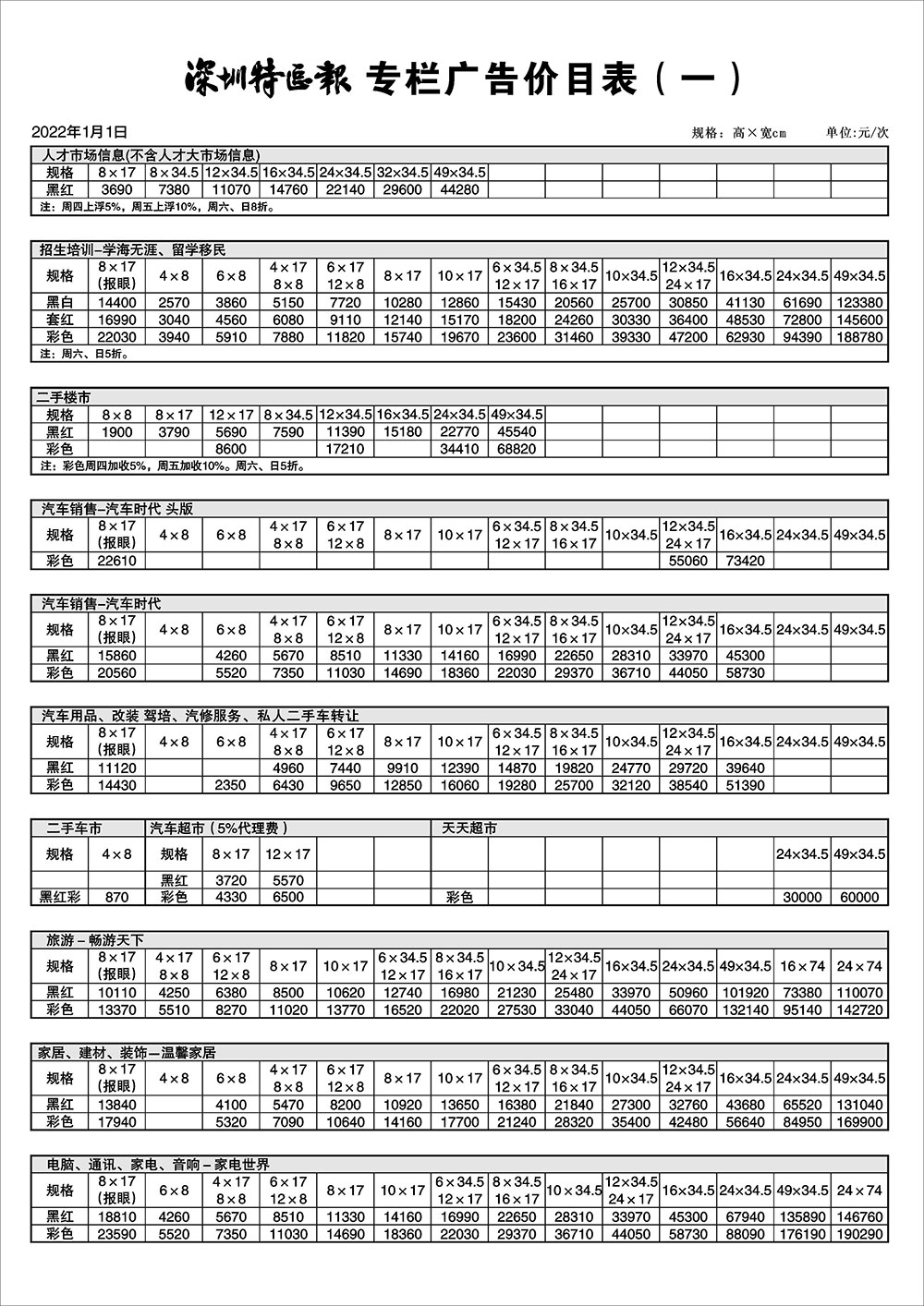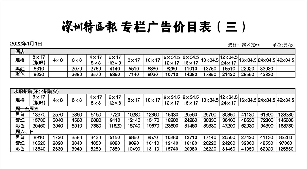 深圳特區(qū)報專欄廣告價目表