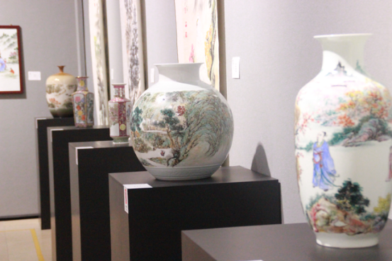 劉致遠(yuǎn)作為國(guó)畫、廣彩陶藝大師劉群興之子,也自幼隨父學(xué)習(xí)國(guó)畫及陶瓷制作,其廣彩作品色澤鮮明,絢麗多彩,既師吸收統(tǒng)繪畫技法,又仿造西洋畫法,頗具嶺南畫派折衷中西的精髓。其國(guó)畫松樹(shù)題材的創(chuàng)作,盡顯崇山峻嶺之中,松之勁峭與水之嫵媚,其繪制的山水題材彩瓷既有山河磅礴之態(tài)勢(shì)、又具匠心細(xì)刻之精致。此次兩位嶺南畫派傳承人在此展出他們的作品,內(nèi)容、風(fēng)格各異,交相輝映,很好地承傳了嶺南畫派的要義。