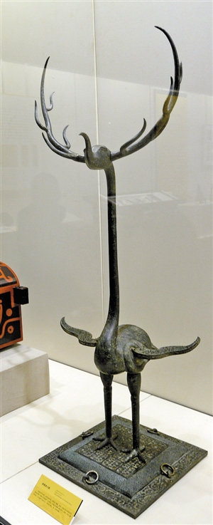 ▲曾侯乙幕出土戰(zhàn)國時(shí)期銅鹿角立鶴。