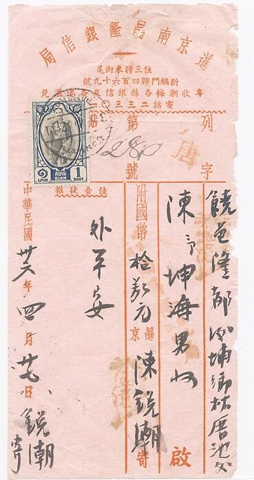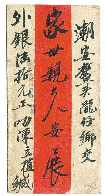 ▲紅條封,僑批封面紅白相間,正中為紅色。常見于清末、民國至新中國成立之后。