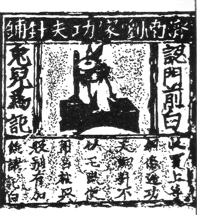 “濟南劉家功夫針鋪”銅雕版的驚人之處還在于,它是用動物形象作為商業(yè)廣告的最早實例。玉兔搗藥是與嫦娥奔月有關(guān)的傳說,民間流傳有多種版本,此處商家選用白兔作為商標的初衷耐人尋味,有人猜測是因為玉兔搗藥所用的鐵杵讓人聯(lián)想到鐵杵磨成針的典故。