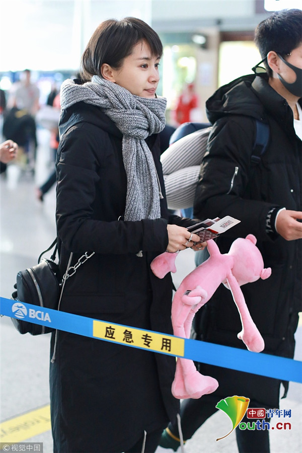 2017年12月10日,北京,王子文現(xiàn)身機場,裹圍巾羞澀撓頭,少女感十足,提溜粉絲所贈“粉紅豹”童心未泯。
