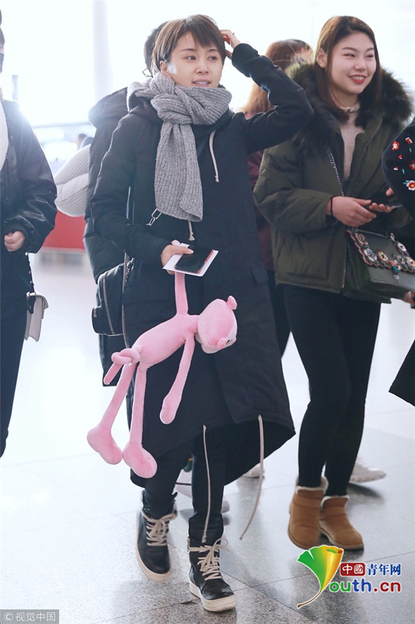 2017年12月10日,北京,王子文現(xiàn)身機場,裹圍巾羞澀撓頭,少女感十足,提溜粉絲所贈“粉紅豹”童心未泯。