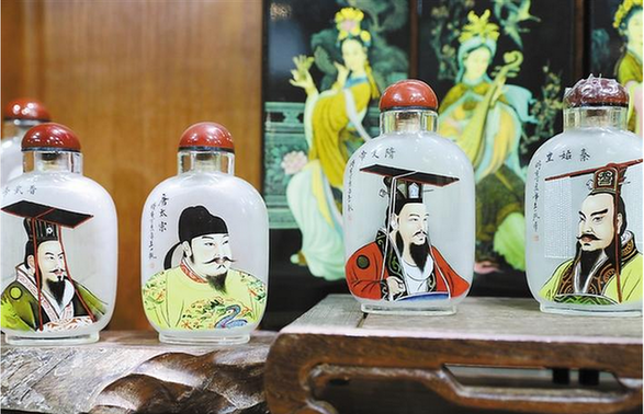 談及創(chuàng)作過程,楊藝說,鼻煙壺內(nèi)畫的制作,一般是在水晶壺或素玻璃壺內(nèi)壁,用特制的細(xì)筆,蘸取少許墨汁顏料,從小口中深入瓶中,反手作畫。創(chuàng)作內(nèi)畫,在常人看來,不可思議之處是有限的空間以及需要反手作畫,這也是每一個內(nèi)畫師面臨的主要難題所在,“創(chuàng)作內(nèi)畫時,需要在這盈寸天地間做到手指和筆桿揮灑自如,這極其考驗一個人的耐性。一手執(zhí)壺,一手作畫,作畫時需要在壺內(nèi)反手描繪,如此,才能讓人們在外部看到正面的畫像結(jié)構(gòu)?!眱?nèi)畫的難度還在于,要長期低頭畫畫,因此還導(dǎo)致頸椎疼痛,中途為了治療疼痛休畫了好長一段時間。