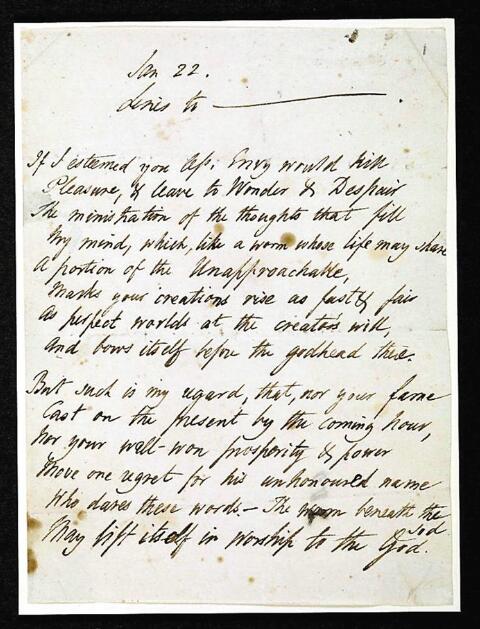 ▲珀西·比希·雪萊的《致拜倫的十四行詩(shī)》草稿。
