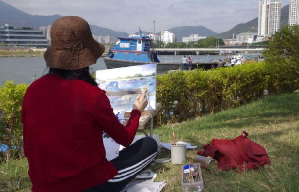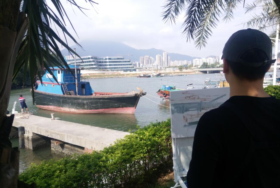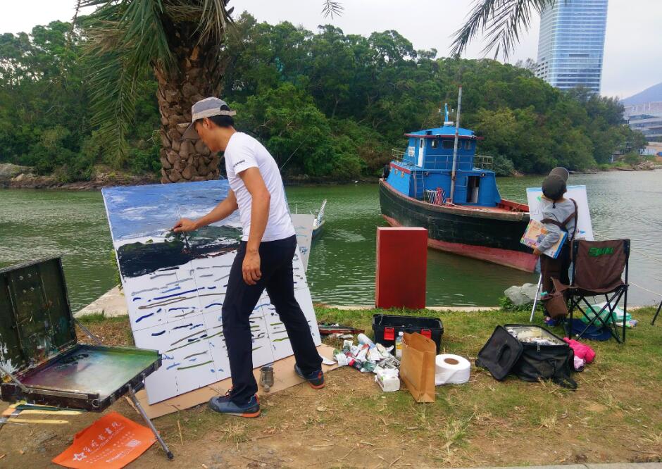優(yōu)美的景色映入畫家們眼簾,點燃了他們的創(chuàng)作激情。來到鹽田之后,藝術家們紛紛找好寫生地點,擺好畫架,迅速進入創(chuàng)作的狀態(tài)。他們當中一部分來到了鹽田漁港,鹽田海鮮街后的小漁村避風港。蔚藍的大海、旁邊的綠樹、避風塘內停泊的船只、白色的海鳥、釣魚的人以及遠方火熱的建設場景都呈現(xiàn)在畫家的筆端;另一部分藝術家來到了位于三洲田深圳會計進修學院的梧桐溪谷,小橋流水人家、奇石山林則一一被傾注于畫紙。