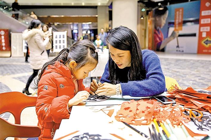 “老師、老師,我也能剪出漂亮的窗花了!”記者在現(xiàn)場看到,很多小朋友都圍在剪紙體驗區(qū),在專業(yè)剪紙老師的指導(dǎo)下學(xué)習(xí)剪紙。經(jīng)過細(xì)心的剪裁,小朋友們終于將手中的紙張變成花卉圖案,他們激動不已,紛紛向老師展示。