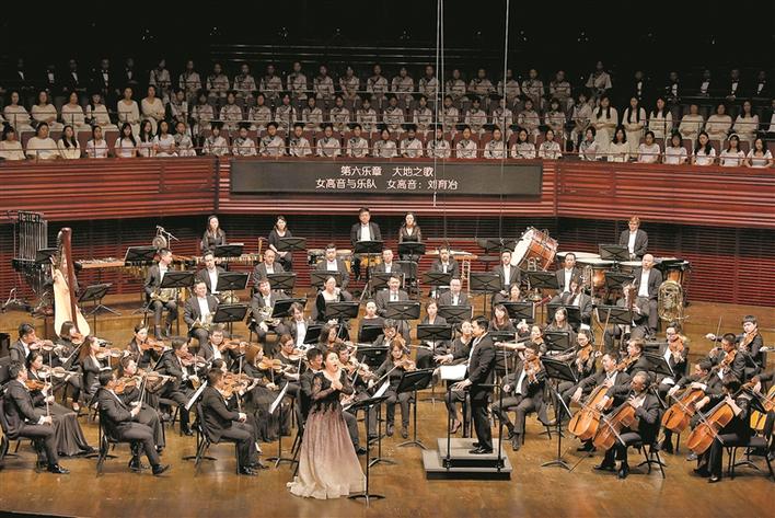 昨晚,大型交響套曲《我的祖國》奏響深圳音樂廳。圖為女高音歌唱家劉育冶傾情演繹《大地之歌》。