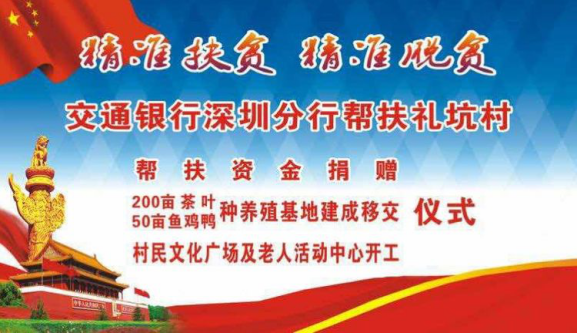 自交通銀行深圳分行對口幫扶禮坑村,開展"雙精準(zhǔn)"扶貧以來,禮坑的經(jīng)濟社會發(fā)展和村容村貌發(fā)生顯著變化,積貧積弱的小山村呈現(xiàn)欣欣向榮的新氣象。積土成山、積水成淵,200畝茶山破土而出、蔚然成綠,50畝養(yǎng)殖基地竣工落成、生機勃勃,三萬魚苗、數(shù)千雞苗茁壯生長,村民文化廣場、老年活動中心、道路硬底項目、山村亮燈工程躍然紙上,逐次開工建設(shè),禮坑正創(chuàng)造并綻放新的希望,村民笑容淳厚,各級由衷點贊。紫金縣領(lǐng)導(dǎo)、縣扶貧工作總負(fù)責(zé)人廖振輝表示:"交通銀行深圳分行是真重視、真扶貧、扶真貧,在對口紫金的扶貧單位中首屈一指,無論在河源市的扶貧工作考評中,還是在代表河源參加的廣東省扶貧工作考評中,雙雙獲得優(yōu)秀評價,真誠感謝交行,紫金要和交行一起努力,讓禮坑成為社會主義新農(nóng)村示范村建設(shè)中的示范點"。