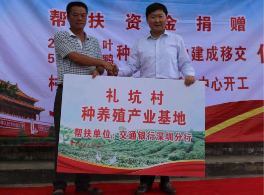 當(dāng)日,交通銀行深圳分行籌劃建設(shè)的茶山、種養(yǎng)殖基地、新一批雞苗和2017年度專項扶貧資金正式移交和撥付給禮坑村,并舉行了村民文化廣場開工奠基典禮。陳隃表示,交行深圳分行把幫扶禮坑村做為落實黨的政策的重點工作,做為國有銀行承擔(dān)政治責(zé)任、社會責(zé)任的重要出發(fā)點,做為加強黨的建設(shè)的重要抓手,下一步圍繞三個轉(zhuǎn)變繼續(xù)深化扶貧工作,一是工作目標(biāo)轉(zhuǎn)向社會主義新農(nóng)村建設(shè),努力將禮坑村建設(shè)成新農(nóng)村建設(shè)示范村中的示范點;二是工作方法從貧困戶脫貧向產(chǎn)業(yè)脫貧轉(zhuǎn)變,繼續(xù)發(fā)掘新項目,形成更加持續(xù)化的產(chǎn)值和收益;三是在制度建設(shè)上下功夫,強化社會主義新農(nóng)村建設(shè)的制度先行和制度示范。