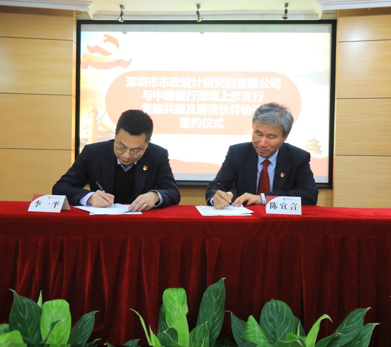 演講結(jié)束后,李一平和陳宜言分別代表中國銀行深圳上步管轄支行黨委和深圳市市政設(shè)計(jì)研究院有限公司黨委簽署了黨建共建和廉潔伙伴合作協(xié)議。