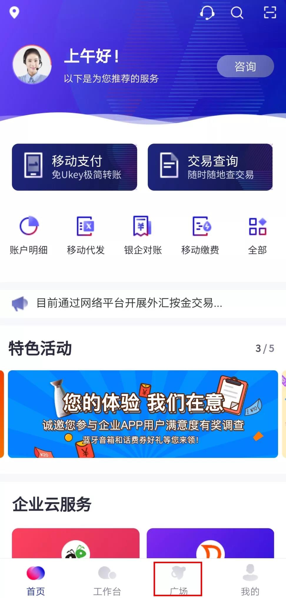 打開招商銀行企業(yè)App,點(diǎn)擊“廣場(chǎng)”板塊,找到深圳專區(qū)。