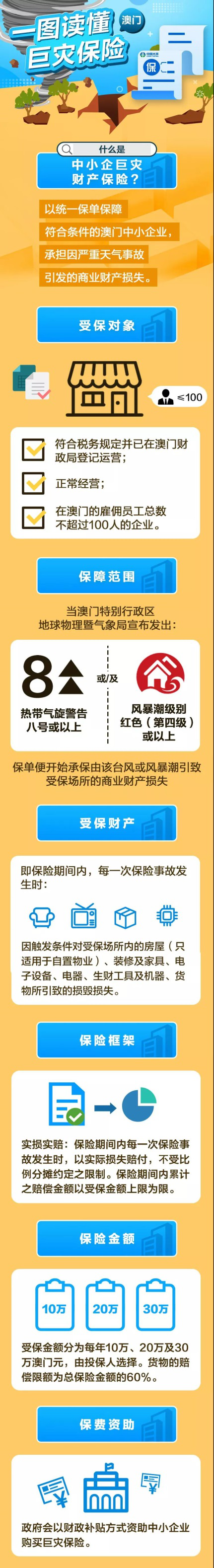 7月31日,今年首個臺風“韋帕”來襲,香港、澳門氣象部門相繼懸掛8號風球,并發(fā)布黃色風暴潮警告。在持續(xù)強降雨和大風之際,澳門金融管理局和經(jīng)濟局舉行聯(lián)合新聞發(fā)布會,宣布推出“中小企巨災財產(chǎn)保險”,為中小企業(yè)在8號風球/紅色風暴潮或以上警告期間,所遭受的商業(yè)財產(chǎn)損失提供保險保障。中國太平旗下太平澳門簽出中小企巨災財產(chǎn)保險第一單,為當?shù)刂行∑髽I(yè)帶來定心丸。