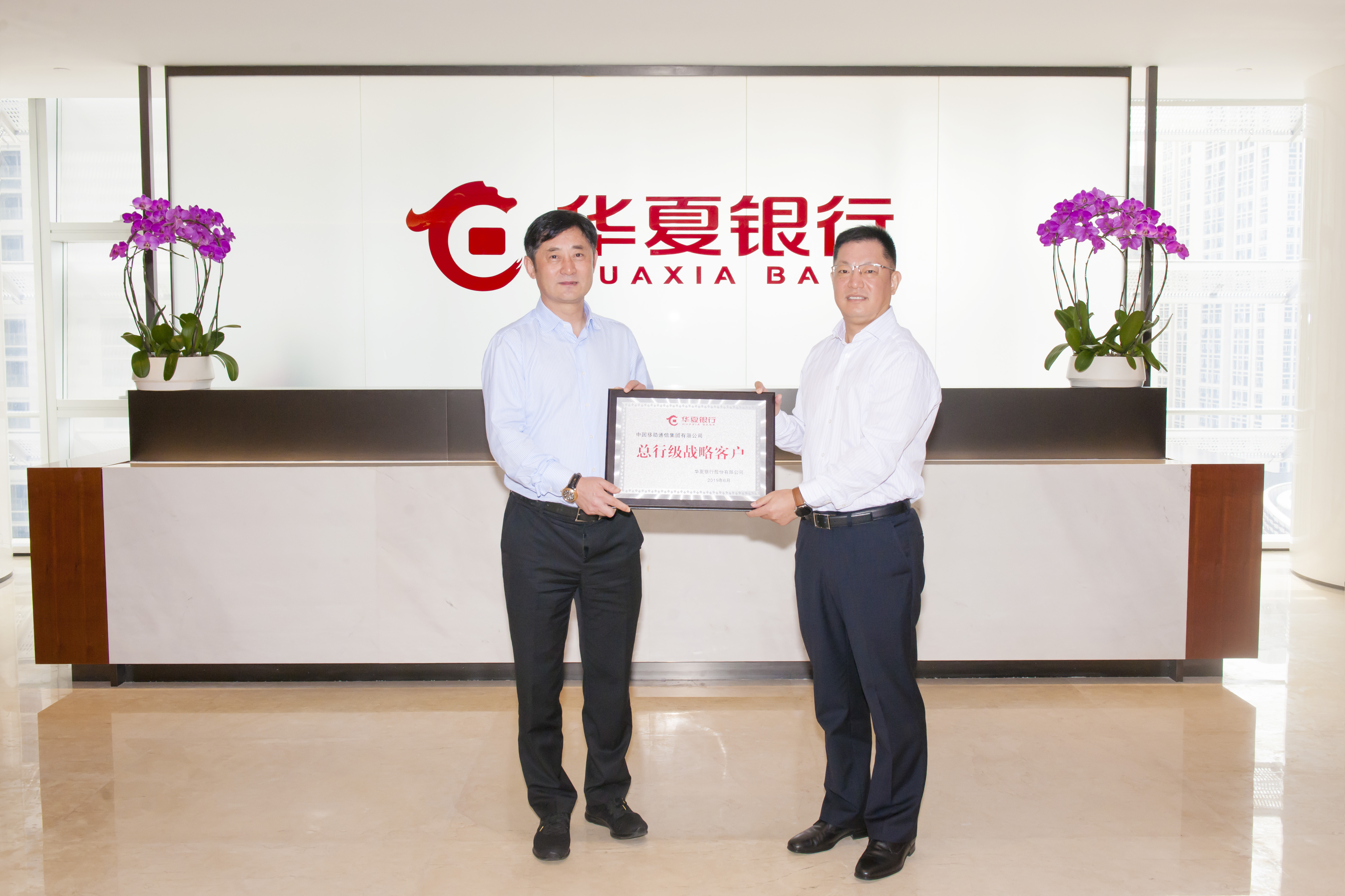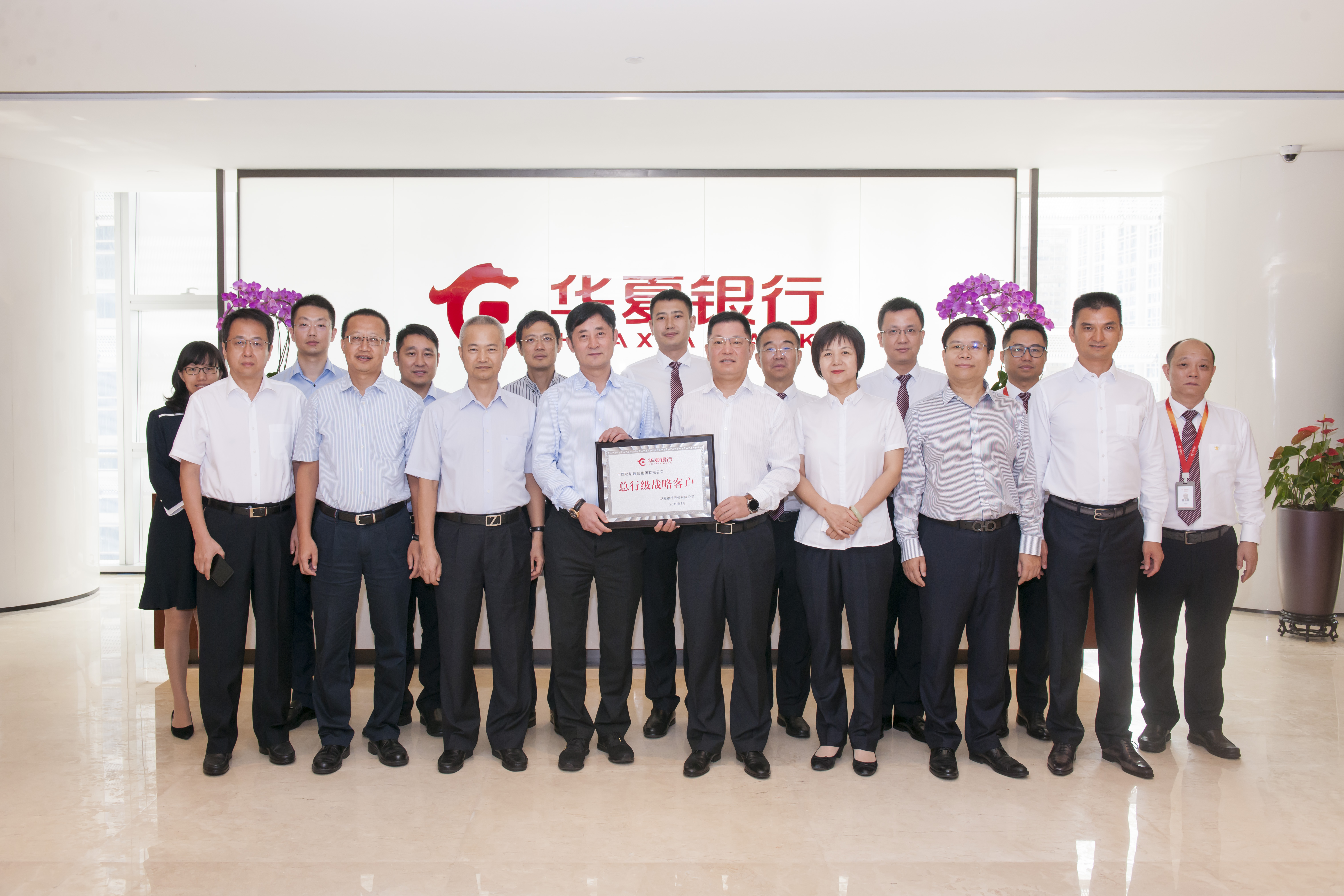 簽約儀式前,華夏銀行深圳分行受總行委托向中國移動通信集團(tuán)有限公司頒發(fā)“總行級戰(zhàn)略客戶”牌匾。