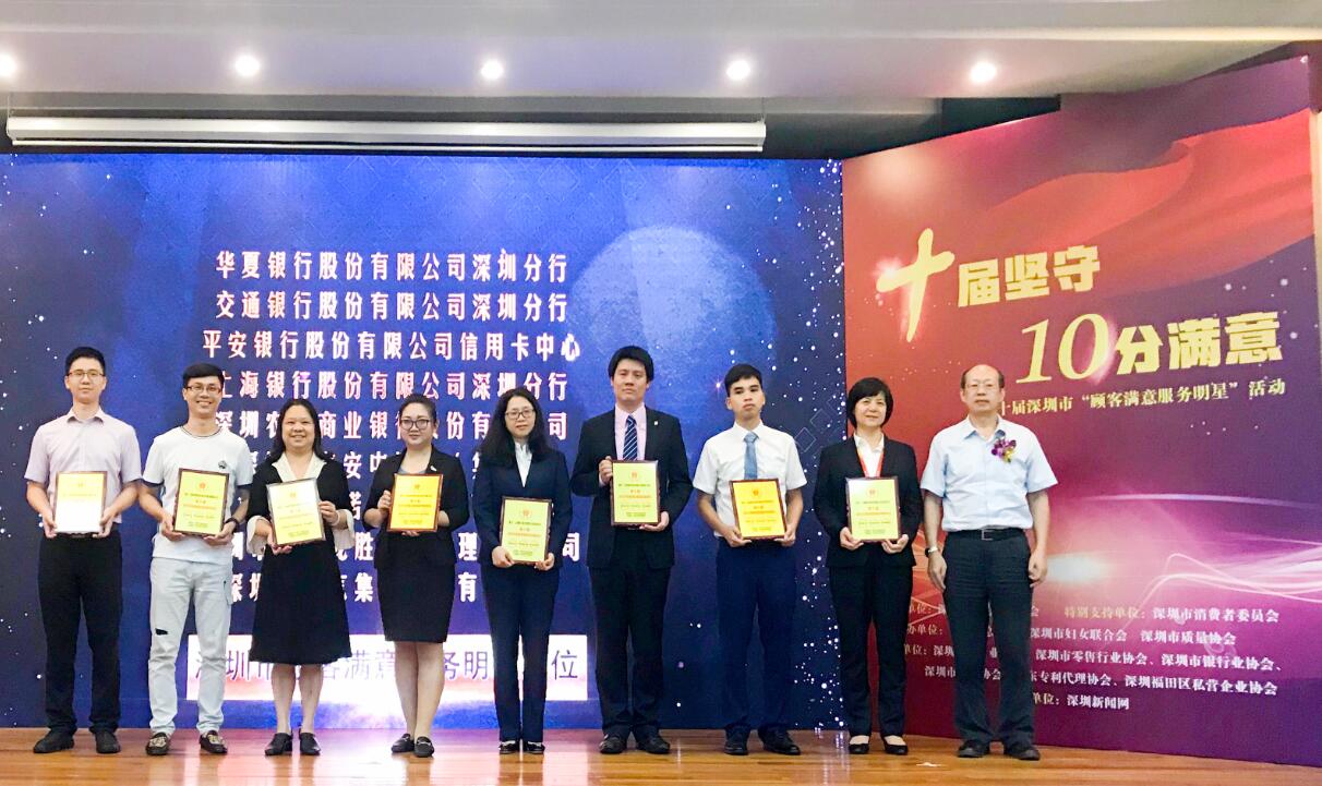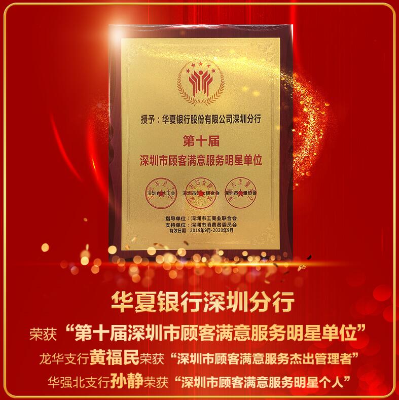 深圳新聞網訊 近日,華夏銀行深圳分行在“第十屆深圳市顧客滿意服務明星”暨“第二屆深圳市優(yōu)質服務示范單位”評選活動中,榮登“深圳市顧客滿意服務明星單位”榜首,“華夏服務”品牌影響力再次得到行業(yè)和客戶的高度認可。同時,該行龍華支行行長黃福民、華強北支行副行長孫靜分別獲得“深圳市顧客滿意服務杰出管理者”和“深圳市顧客滿意服務明星”榮譽稱號。