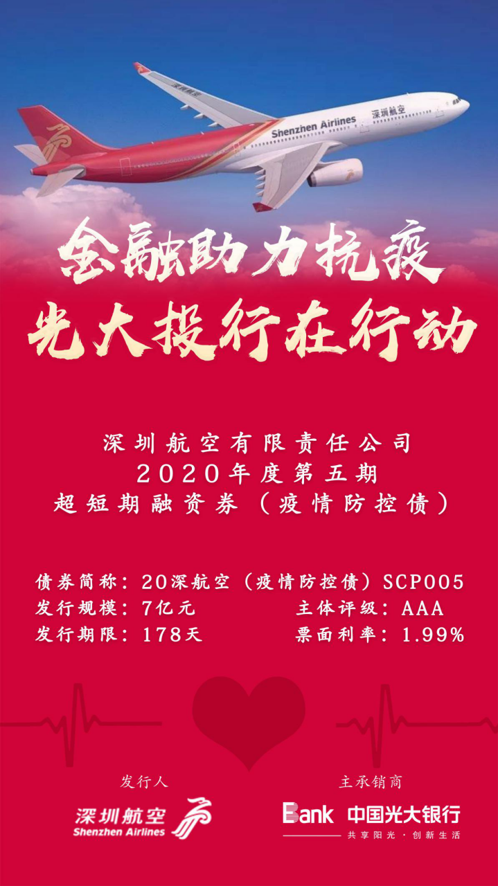 深圳新聞網(wǎng)2月12日訊 為積極響應國家抗疫號召,支持疫情防控企業(yè)債券融資,光大銀行總行戰(zhàn)投部和深圳分行迅速反應,堅決貫徹落實光大集團及光大銀行總行黨委關于新型冠狀病毒肺炎疫情防控的有關要求,于2月11日成功發(fā)行深圳航空有限責任公司2020年度第五期超短期融資債券(疫情防控債) ,發(fā)行規(guī)模7億元,期限178天,票面利率僅為1.99%。其中,2億元募集資金將用于補充深圳航空為旅客免費辦理退票、改期等支出產(chǎn)生的營運資金需求以及免費提供防疫物資、醫(yī)療人員等運輸產(chǎn)生的營運資金需求。