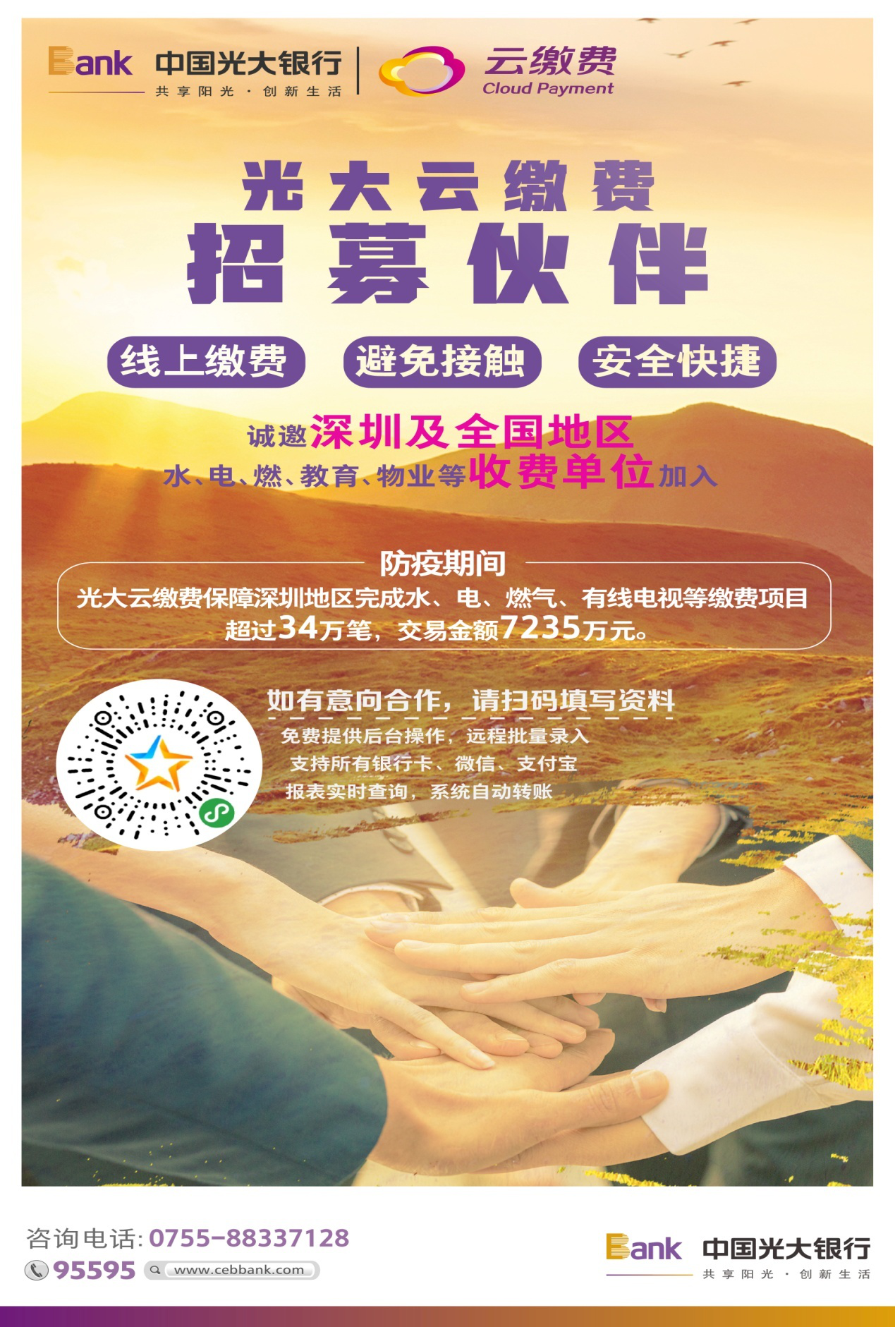 見圳客戶端·深圳新聞網(wǎng)2月26日訊 守望相助,共克時艱。面對新型冠狀病毒疫情防控的緊張形勢,為有效阻斷病毒傳播渠道,光大銀行深圳分行積極響應國家號召,充分發(fā)揮云繳費線上便民繳費服務優(yōu)勢,全力保障全國,特別是重點地區(qū)水、電、燃等主要生活繳費線上通道穩(wěn)定暢通運行,足不出戶,完成各類繳費,最大限度降低了居民的出行風險,全面助力打贏“防疫”阻擊戰(zhàn)。