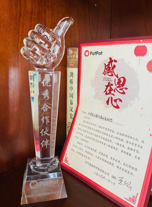 深圳新聞網(wǎng)3月16日訊 2020年新春伊始,光大銀行深圳寶中支行收到來自PATPAT平臺(tái)發(fā)來的感謝信,榮獲PATPAT平臺(tái)頒發(fā)的“優(yōu)秀合作伙伴”獎(jiǎng)。