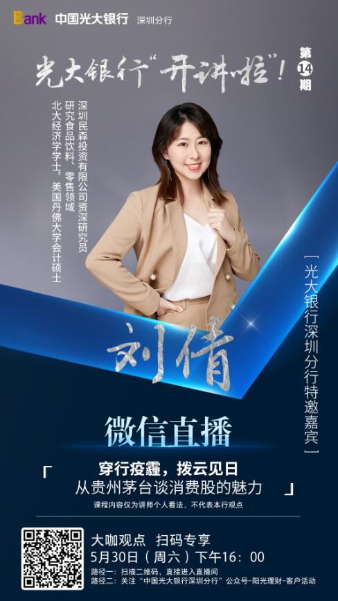 此次,光大銀行深圳分行攜手鳳凰深圳財(cái)經(jīng),邀請(qǐng)到北大經(jīng)濟(jì)學(xué)碩士、美國丹佛大學(xué)會(huì)計(jì)碩士、深圳民森投資有限公司資深研究員劉倩女士,在線為客戶帶來《穿行疫霾,拔云見日——從貴州茅臺(tái)看消費(fèi)股的魅力》主題分享。據(jù)悉,劉倩女士關(guān)注于食品飲料、零售領(lǐng)域的投資研究。此次分享,她以眾所熟知的茅臺(tái)酒為案例,結(jié)合A股2000年至2018年漲幅數(shù)據(jù)、茅臺(tái)歷史、品牌發(fā)展、銷售渠道、市場(chǎng)占有等多方面,介紹孕育牛股搖籃的消費(fèi)股投資邏輯,幫助更多客戶在全球受疫情沖擊、經(jīng)濟(jì)不確定時(shí)期,了解A股牛股市場(chǎng)邏輯、知曉投資策略提升個(gè)人資產(chǎn)。