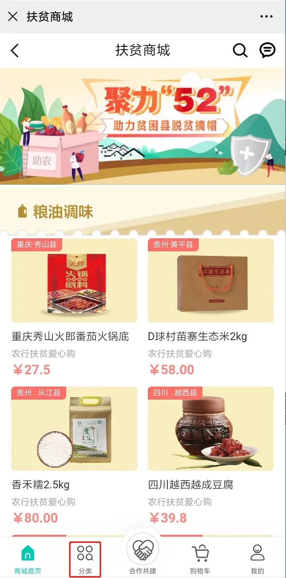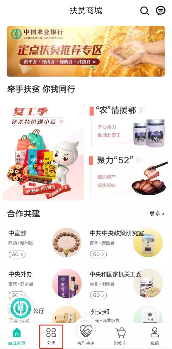 進(jìn)入“扶貧商城”,點(diǎn)擊“分類”