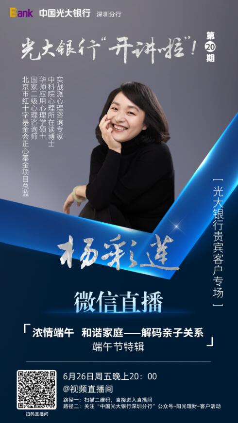見圳客戶端·深圳新聞網(wǎng)2020年6月24日訊 端午節(jié)臨近,光大銀行深圳分行將攜手深圳熱線于6月26日,在線開展第二十期《光大銀行"開講啦“!》公益課堂。