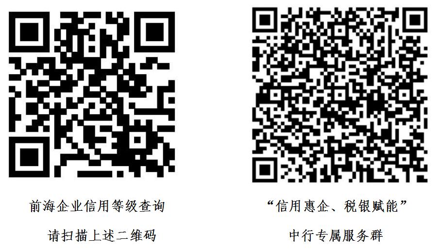 前海注冊企業(yè)可通過下左二維碼查詢前海信用等級,可通過下右二維碼加入“信用惠企、稅銀賦能”中行專屬服務群(入群請備注企業(yè)名稱),了解咨詢深圳中行針對前?!氨趟{企業(yè)”和“湛藍企業(yè)”的十項具體服務內(nèi)容。(黃璜)