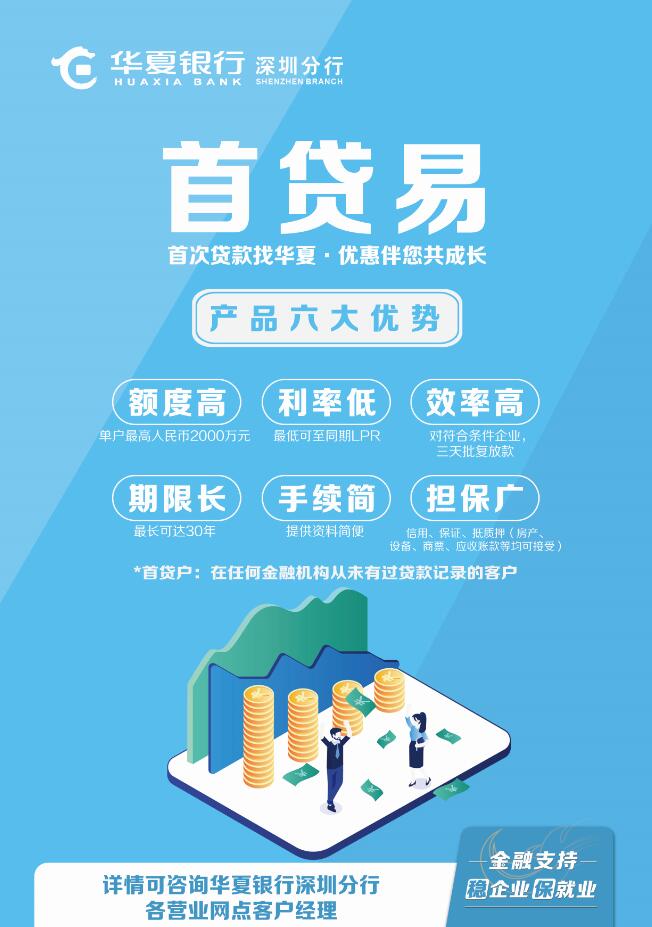為滿足廣大中小微民營(yíng)企業(yè)的資金需求,加大信貸投放精準(zhǔn)滴灌,華夏銀行創(chuàng)新推出“首貸易”產(chǎn)品,向首貸戶(是指在任何金融機(jī)構(gòu)從未有過(guò)貸款記錄的客戶)承諾“首次貸款找華夏,優(yōu)惠伴您共成長(zhǎng)”的全方面、定制金融服務(wù)。“首貸易”產(chǎn)品具有“六大突出優(yōu)勢(shì)”,額度高、利率低、效率高、期限長(zhǎng)、手續(xù)簡(jiǎn)、擔(dān)保廣。