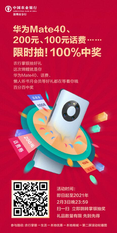 深圳新聞網(wǎng)·見(jiàn)圳客戶(hù)端2021年1月2日訊 農(nóng)歷新年越來(lái)越近,農(nóng)行掌銀讓您足不出戶(hù),動(dòng)動(dòng)手指抽好禮,這次錦鯉就是你!華為Mate40、200元話費(fèi)、100元話費(fèi)等好禮,限時(shí)抽。