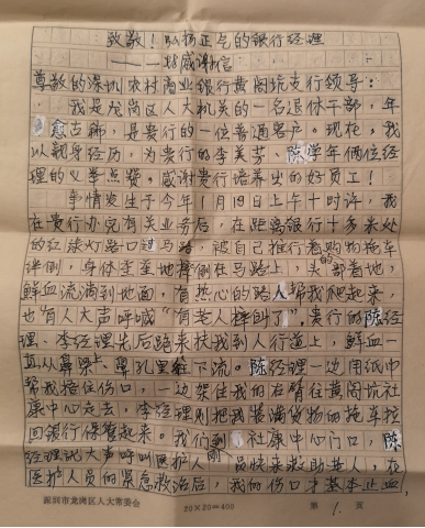 “事發(fā)第二天,該行行長又派陳學(xué)年、李美芳兩位員工到我家探望、慰問,讓我全家非常感動?!?月29日下午,傷口剛剛拆線的老人就帶著手寫的感謝信來到深圳農(nóng)商行黃閣坑支行,向幫助過他的兩位熱心人表達感謝之情。感謝信整整三頁紙,字跡工整,老人家的誠摯感謝之意躍然紙上。