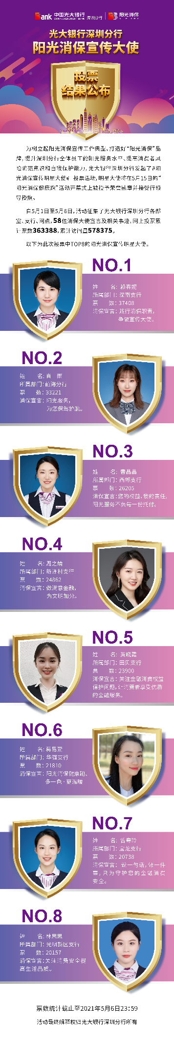 深圳新聞網(wǎng)·見圳客戶端2021年5月8日訊 昨日,光大銀行深圳分行“陽光消保宣傳明星大使”線上投票圓滿結(jié)束,從58名宣傳大使中投票產(chǎn)生了賴春妮、肖雨、曹晶晶、周之靖、黃曉霞、蔣易萱、曾粵玲、林思思8名陽光消保宣傳明星大使。明星大使將在5月15日的“陽光消保健康跑”活動開幕式上被授予榮譽(yù)勛章并接受行領(lǐng)導(dǎo)授旗。5月1日,光大銀行深圳分行發(fā)起了“陽光消保宣傳明星大使”線上投票,旨在樹立起陽光消保宣傳工作典型,打造“陽光消?!逼放?,提升深圳分行全體員工的陽光服務(wù)水平,提高消費(fèi)者風(fēng)險(xiǎn)防范意識和自我保護(hù)能力,提升光大在深圳地區(qū)的品牌影響力。投票活動得到社會熱烈響應(yīng),據(jù)統(tǒng)計(jì),此次累計(jì)票數(shù)達(dá)363388次。