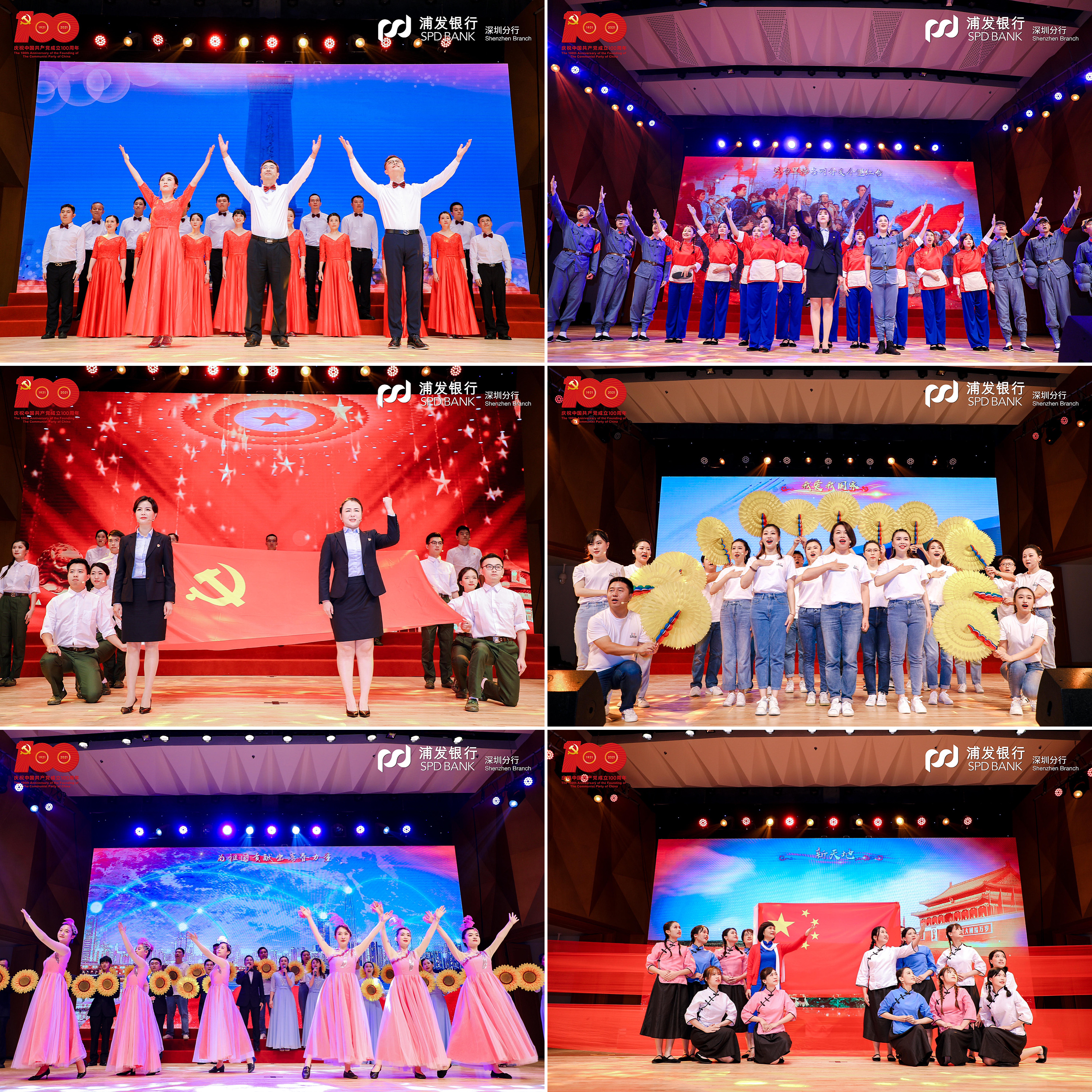 在黨支部風(fēng)采展示環(huán)節(jié),該行基層黨支部精心編排12首紅色經(jīng)典,通過4個(gè)篇章再現(xiàn)百年波瀾壯闊的偉大歷程。第一篇章“開天辟地”演繹了中國共產(chǎn)黨在新民民主義革命時(shí)期完成救國大業(yè)的輝煌歷程,《保衛(wèi)黃河》吹響了高亢嘹亮的愛國號角,《十送紅軍》深情演繹血濃于水軍民情,《繡紅旗》一腔熱血帶著大家重回歌樂山。第二篇章“改天換地”回顧了中國共產(chǎn)黨在社會主義革命和建設(shè)時(shí)期完成興國大業(yè)的奮斗史詩,《歌唱祖國》撥動人們最難忘的記憶,《我們走在大路上》展現(xiàn)當(dāng)年敢闖敢拼的奮進(jìn)之姿態(tài),《唱支山歌給黨聽》唱出人民心中永恒的贊歌。第三篇章“翻天覆地”再現(xiàn)了中國共產(chǎn)黨在改革開放和社會主義現(xiàn)代化建設(shè)新時(shí)期推進(jìn)富國大業(yè)的光榮壯舉,《在燦爛陽光下》重現(xiàn)春風(fēng)化雨之后的奮斗時(shí)光,《國家》打動多少人的赤子之心,《我們的生活充滿陽光》訴說了改革開放背后的喜悅。第四篇章“驚天動地”展現(xiàn)了中國共產(chǎn)黨在中國特色社會主義新時(shí)代推進(jìn)并將在本世紀(jì)中葉實(shí)現(xiàn)強(qiáng)國大業(yè)的偉大時(shí)代,一首《天耀中華》是浦發(fā)人最深沉的表達(dá),《燈火里的中國》讓人漫步燈火漫卷的萬里山河,《再一次出發(fā)》展示浦發(fā)追夢者的雄姿英發(fā)。走過“百年風(fēng)雨”,浦發(fā)銀行深圳分行合唱團(tuán)一首《我和我的祖國》,蓬勃朝氣盡顯拳拳愛國心、濃濃赤子情。篇章結(jié)束,大家全體起立,高聲合唱《沒有共產(chǎn)黨就沒有新中國》,以最真摯最熱烈的歌聲獻(xiàn)禮建黨百年。