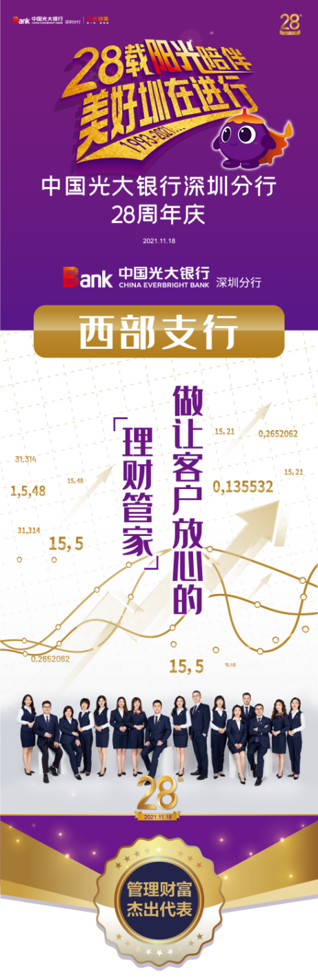 作為財(cái)富管理業(yè)務(wù)的先行者,光大銀行一直致力追求做讓客戶放心的“理財(cái)管家”。西部支行始終堅(jiān)定朝著總分行打造“一流財(cái)富管理銀行”的戰(zhàn)略目標(biāo)方向趕超奔跑,建設(shè)專業(yè)的財(cái)富管理團(tuán)隊(duì),管理財(cái)富,服務(wù)民生。在光大銀行深圳分行28周年的“十大最美光陰故事”管理財(cái)富類評選中,西部支行脫穎而出,獲評管理財(cái)富杰出代表。