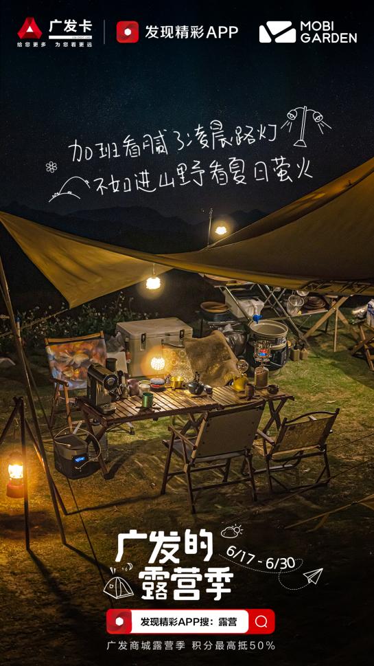 讀特客戶端?深圳新聞網(wǎng)2022年7月6日訊(記者 朱琳)一頂帳篷、一片草地、一桌餐品,呼吸戶外新鮮空氣放松身心……露營逐漸成為年輕人的戶外休閑方式。對(duì)此,廣發(fā)信用卡繼推出國內(nèi)首個(gè)沉浸式夜宿露營發(fā)布會(huì)之后,近日又以露營主題切入新世代年輕人的需求點(diǎn),布局戶外露營場(chǎng)景,上線為期兩月的“廣發(fā)的露營季”主題活動(dòng),在提倡城市生活“慢下來,去感受”理念的同時(shí),也釋放了一大波戶外露營標(biāo)配商品的折扣福利干貨。