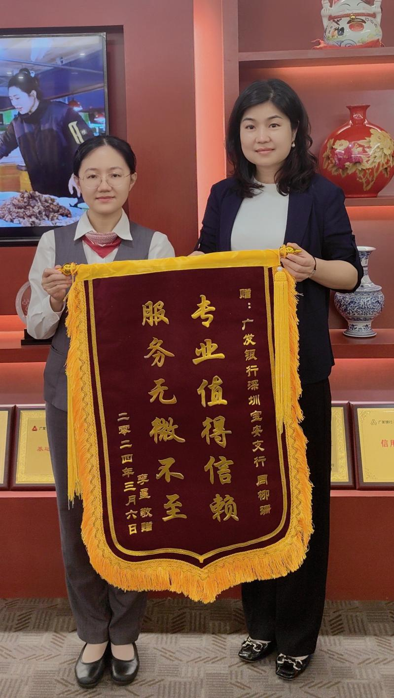 深圳新聞網(wǎng)2024年5月11日訊(記者 朱琳)“真的太感謝廣發(fā)銀行了!要不是廣發(fā)銀行專業(yè)高效的服務(wù),我這筆貨款都不知何時(shí)能付出去!”小微企業(yè)主李先生握著廣發(fā)銀行深圳寶安支行服務(wù)經(jīng)理周柳珊的手激動(dòng)地說,隨后將一面印有“服務(wù)無微不至,專業(yè)值得信賴”的錦旗送到她的手中,向該行熱情、高效、暖心的服務(wù)表示感謝。錦旗上十二個(gè)金燦燦的大字寄托了客戶對(duì)廣發(fā)銀行沉甸甸的信任和堅(jiān)定不移的支持。
