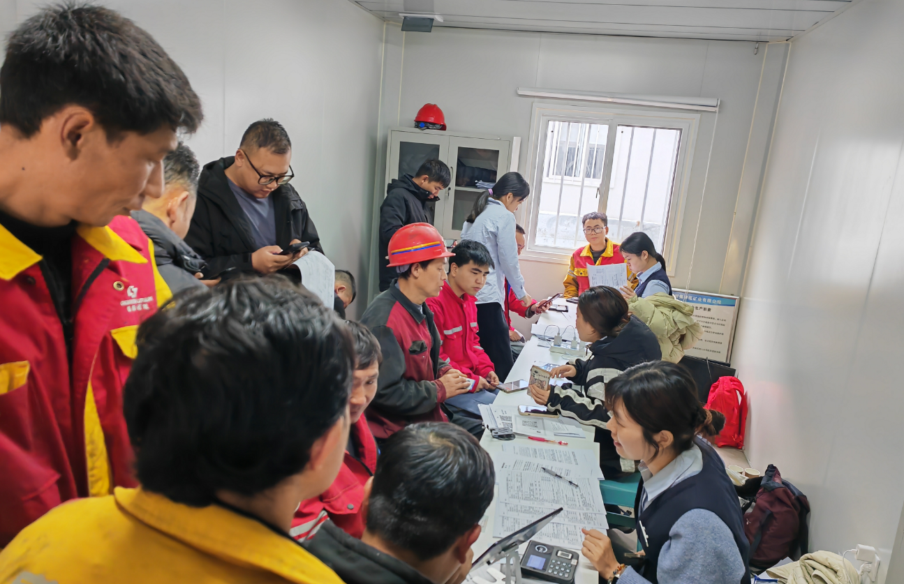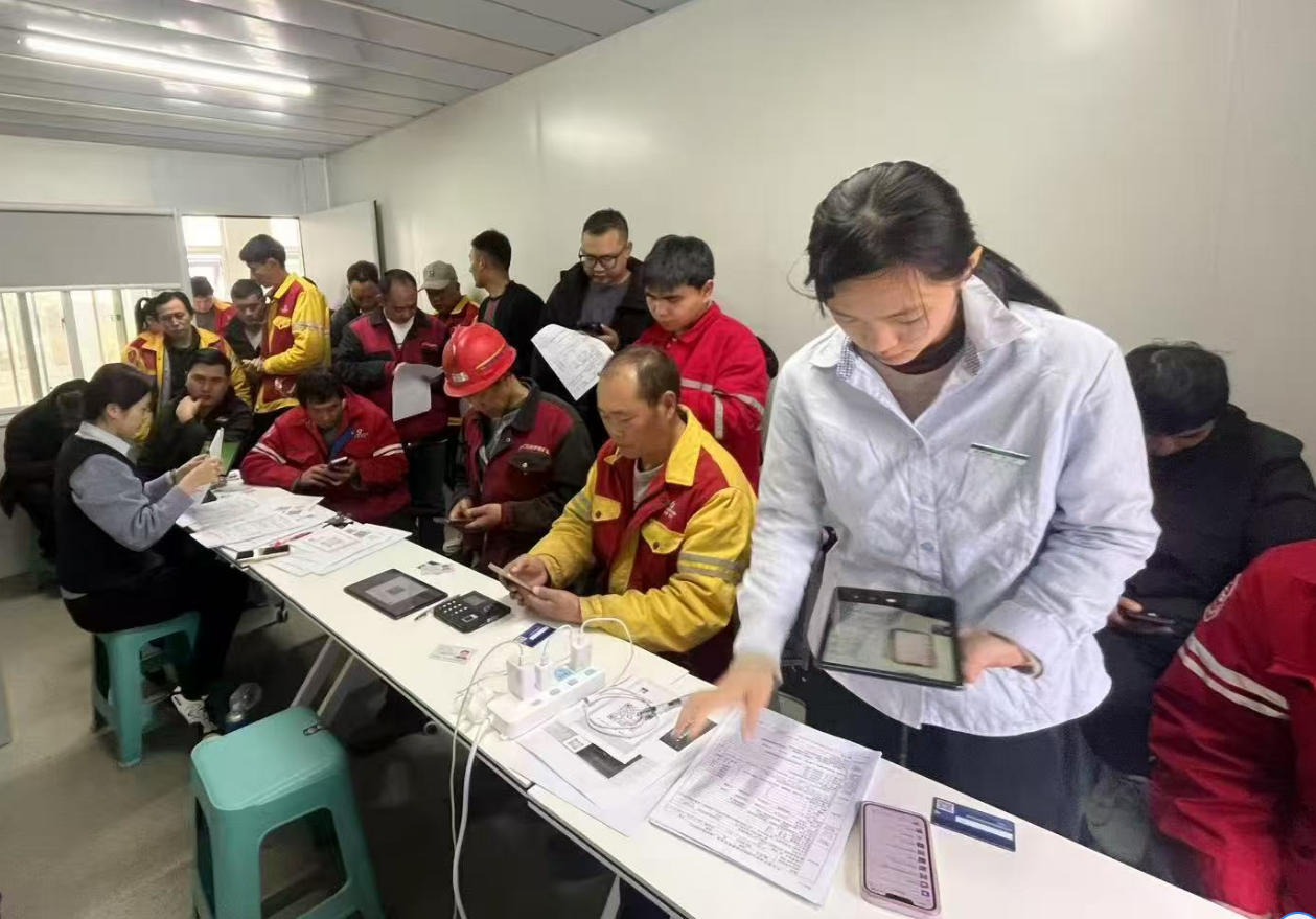 面對困難,陳嘉濤深知客戶需求無小事。他果斷決定帶隊前往現(xiàn)場,為當(dāng)?shù)貑T工集中辦理銀行卡開卡及工資代發(fā)相關(guān)手續(xù)。從繁華的深圳到偏遠的高原,路途遙遠、舟車勞頓,加上高原反應(yīng)帶來的身體不適,讓整個團隊面臨嚴峻考驗。但他們沒有絲毫退縮,抵達后便迅速搭建臨時服務(wù)點,投入到緊張的工作中。