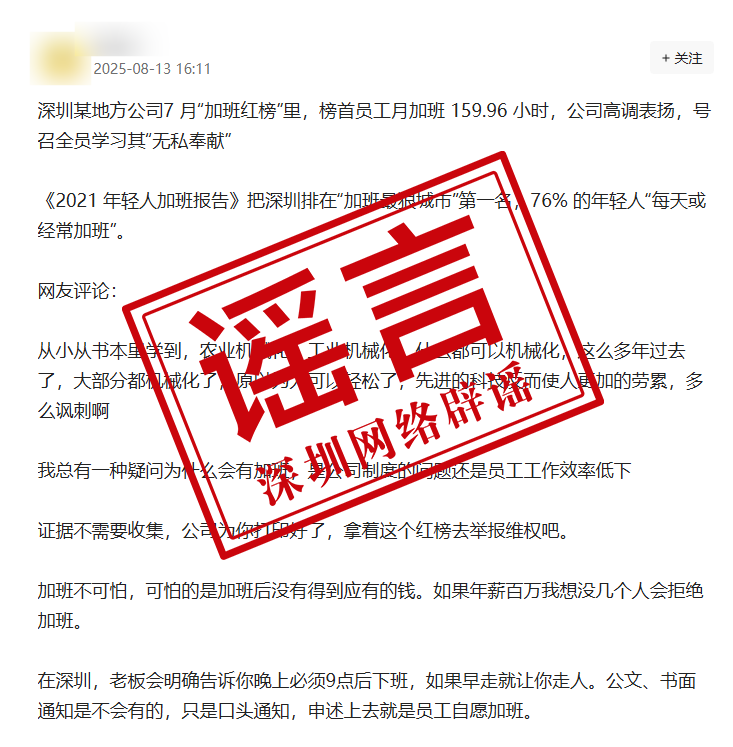 近日,一則《關(guān)于加班的通報(bào)表?yè)P(yáng)》在社交平臺(tái)引發(fā)熱議。部分網(wǎng)帖將涉事企業(yè)與深圳強(qiáng)行關(guān)聯(lián),冠以“深圳某公司”名義進(jìn)行傳播,并稱深圳存在普遍的加班現(xiàn)象。經(jīng)核實(shí),涉事企業(yè)非深圳企業(yè)。