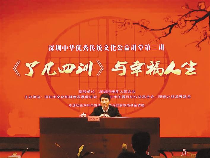 深圳商報2019年03月18日訊 (記者 夏和順/文 韓墨/圖)近日,深圳中華優(yōu)秀傳統(tǒng)文化公益講堂第三場在深圳市殘疾人綜合服務(wù)中心開講,這也是傳統(tǒng)文化講堂首次“送課上門”。著名作家郭文斌與市殘聯(lián)系統(tǒng)200多名干部分享“東方勵志奇書”《了凡四訓(xùn)》所蘊含的人生哲理,探討“安詳生活理念”與幸福人生的關(guān)系。據(jù)介紹,本次活動由中華炎黃文化研究會文明傳承委員會、深圳市文明辦指導(dǎo),深圳市文化與健康發(fā)展促進會主辦。