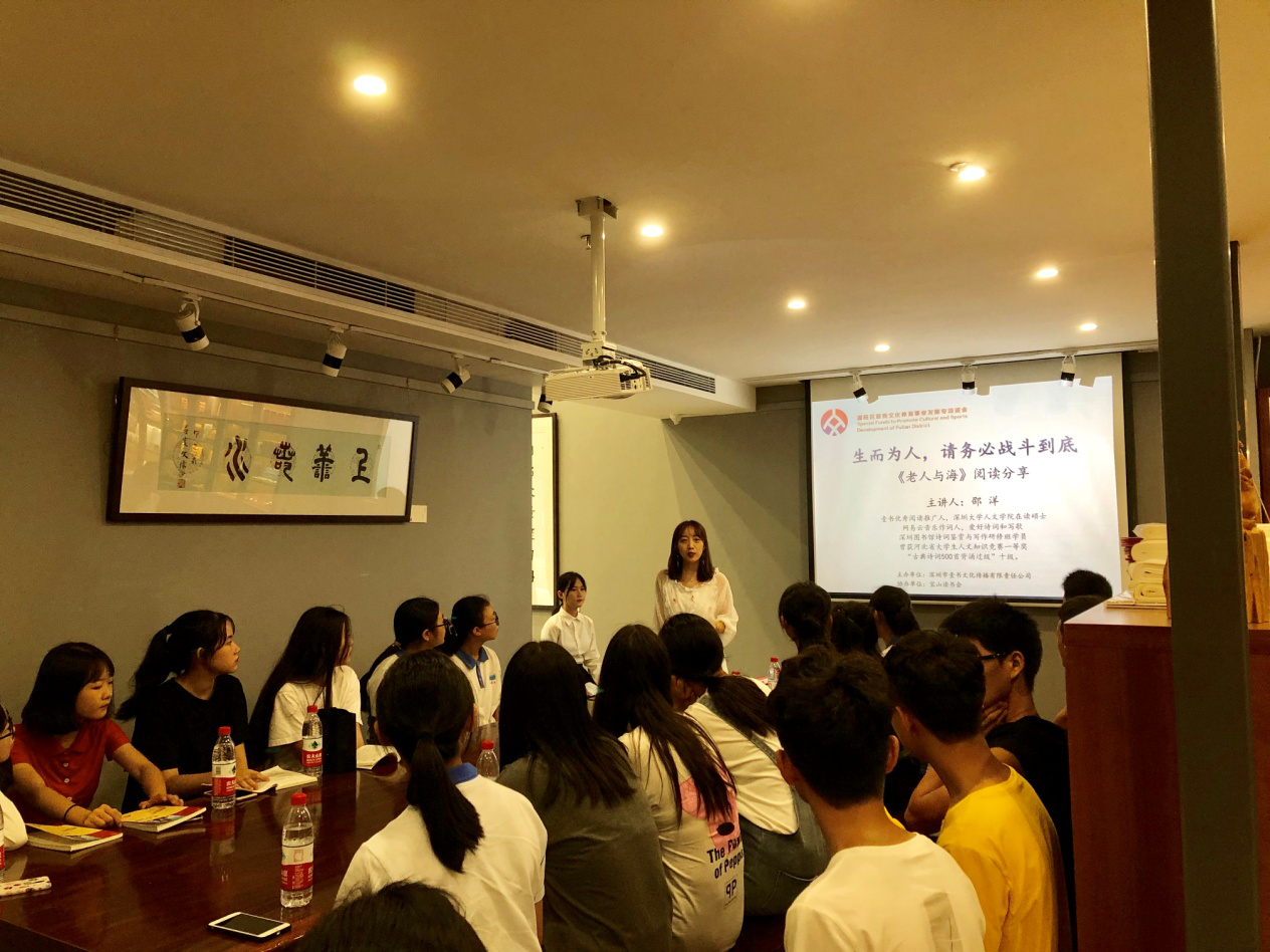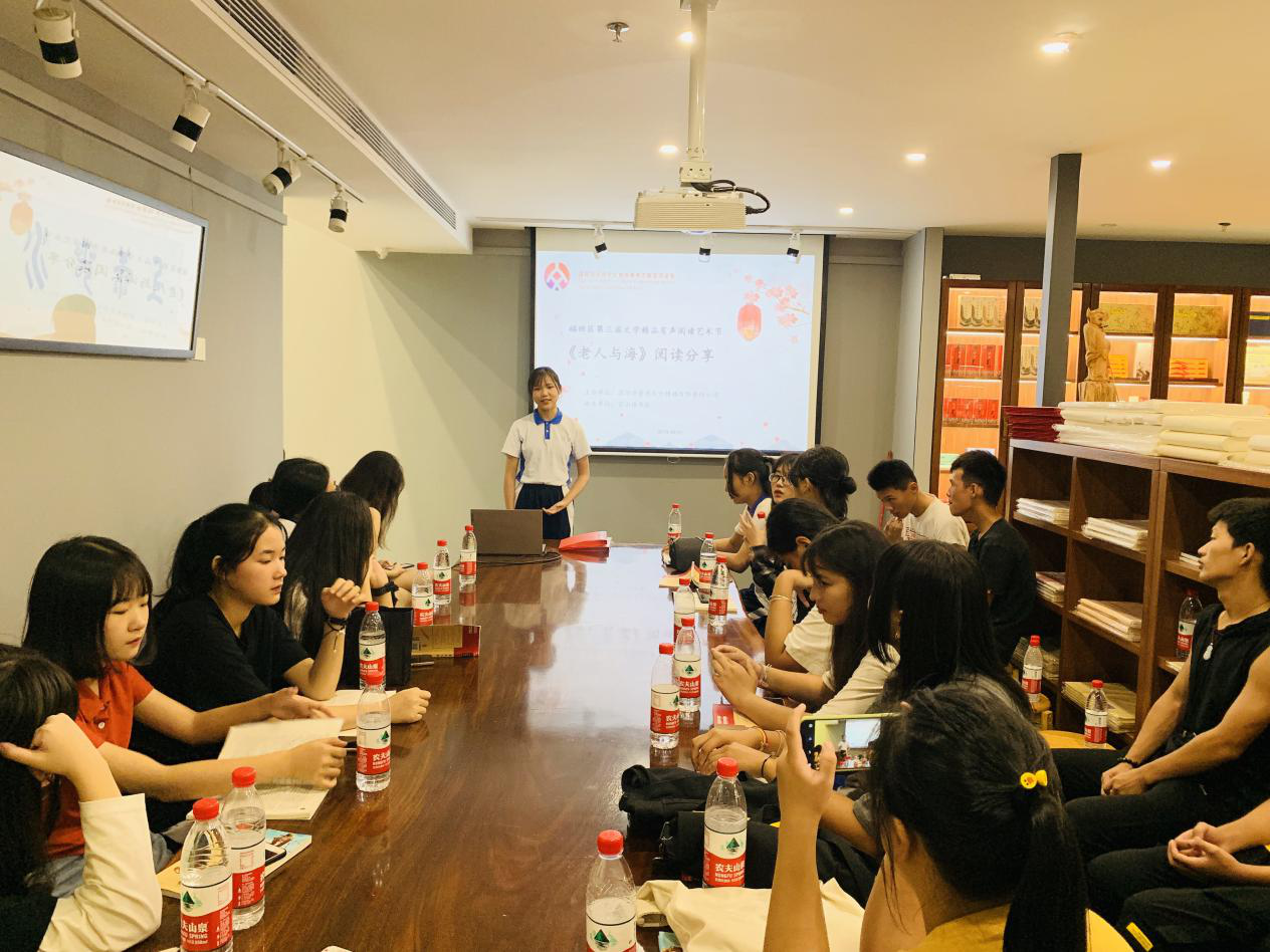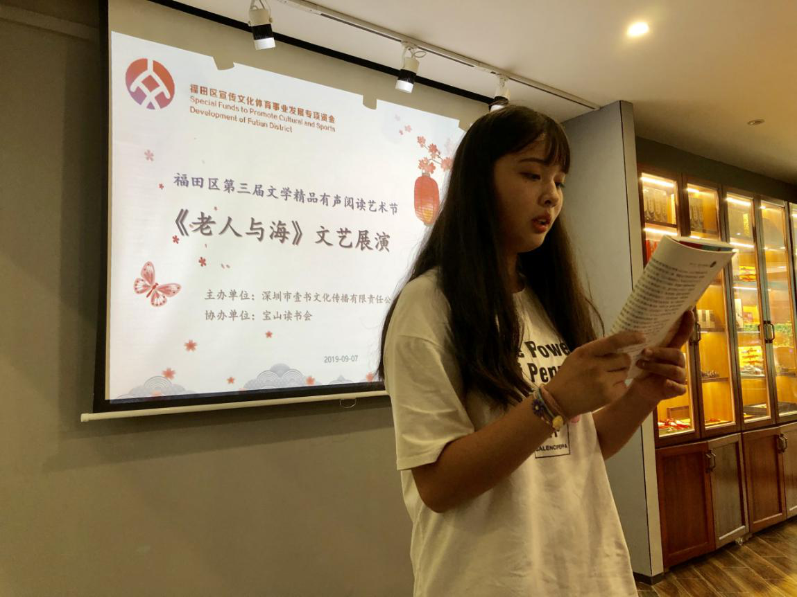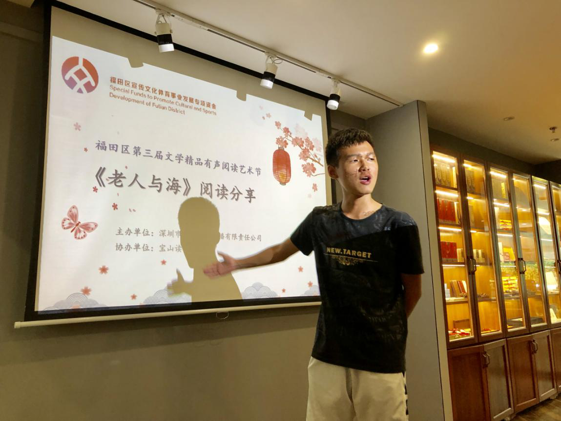 深圳新聞網(wǎng)訊 2019年9月7日,由深圳市壹書文化傳播有限責(zé)任公司主辦、寶山讀書會協(xié)辦的“福田區(qū)第三屆文學(xué)精品有聲閱讀藝術(shù)節(jié)”之《老人與?!烽喿x分享會暨文學(xué)作品朗誦會在簡閱書吧香蜜湖店成功舉辦。來自深圳市寶山技工學(xué)校的學(xué)子們在主講人的啟示下分享閱讀感悟、誦讀精彩文摘,在文藝展演中體會圣地亞哥抗擊命運的人生哲學(xué)。