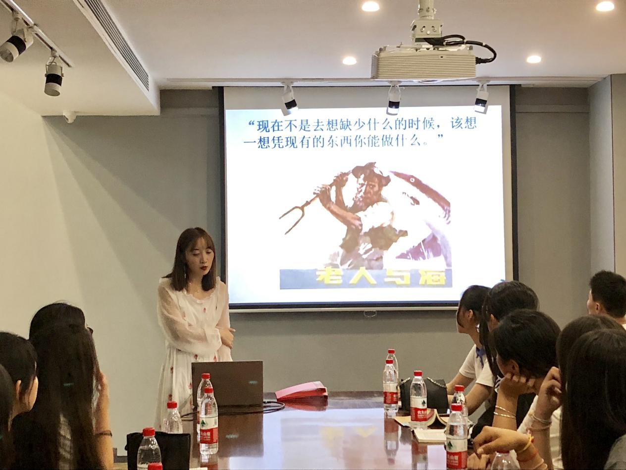 《老人與?!吠ㄟ^講述一個老漁夫的故事,揭示了人類共同的命運,給讀者帶來關(guān)于勇氣、不屈不撓、與命運作斗爭的精神啟迪。圍繞“生而為人,請務(wù)必戰(zhàn)斗到底”這一主題,邵洋提出了“是選擇放棄,還是一往直前?”這一問題,引起在座同學(xué)的思考。隨后,她又通過解讀《老人與海》中的喻象與藝術(shù)、生命與理想,為同學(xué)們總結(jié)值得學(xué)習(xí)的寫作思路。
