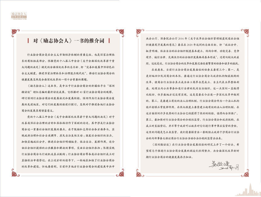 在《勵志協(xié)會人》40年40家40人的編著過程中,得到社會各界的關(guān)注、支持和高度肯定, 著名的經(jīng)濟學(xué)家吳敬璉說《勵志協(xié)會人》研討了深圳行業(yè)協(xié)會商會的發(fā)展?fàn)顩r和發(fā)展經(jīng)驗。深圳微訪談在行業(yè)協(xié)會商會發(fā)展經(jīng)驗的研究上開了一個好頭,希望有志于推進行業(yè)協(xié)會商會發(fā)展的朋友們共同努力,為全面深化改革新時期行業(yè)協(xié)會商會的健康發(fā)展添力加油。