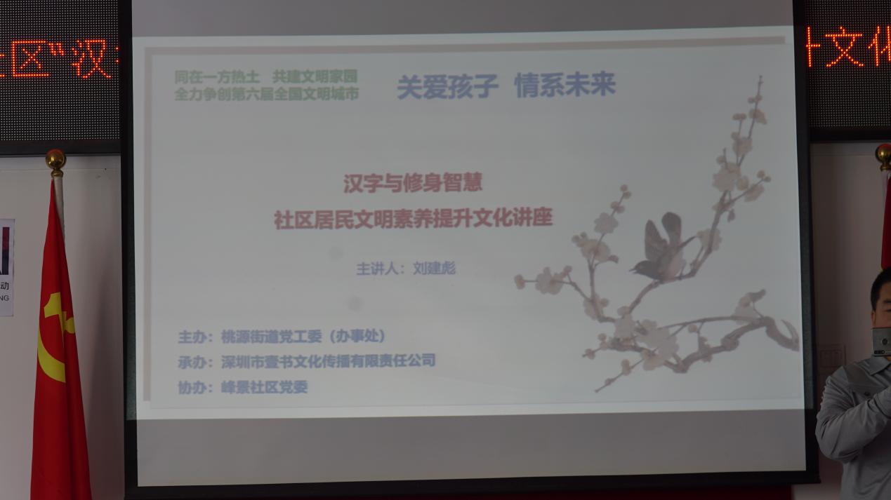 深圳新聞網(wǎng)訊 為切實(shí)做好桃源街道辦創(chuàng)建第六屆全國文明城市迎檢工作,提升轄區(qū)居民的文明素養(yǎng),桃源街道辦攜手壹書文化在11月份開展“‘漢字與修身智慧’社區(qū)居民文明素養(yǎng)提升”項(xiàng)目,由《漢字與修身智慧》作者劉建彪到桃源街道辦轄區(qū)內(nèi)12個(gè)社區(qū)開展12場(chǎng)“‘漢字與修身智慧’社區(qū)居民文明素質(zhì)提升”專題講座,從中華文明的基因(漢字)出發(fā),解讀深圳市民公約,旨在啟發(fā)居民在優(yōu)秀傳統(tǒng)文化的感召之下,修身潤德,踐行文明禮儀,用實(shí)際行動(dòng)去推進(jìn)文明城市的創(chuàng)建。