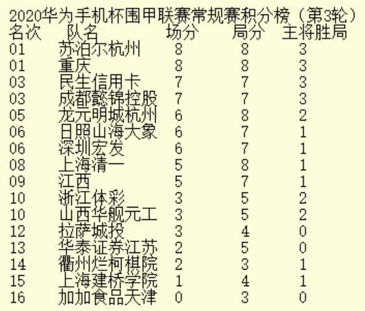 2020華為手機(jī)杯中國(guó)圍棋甲級(jí)聯(lián)賽第三輪深圳宏發(fā)3:1浙江體彩。具體戰(zhàn)況如下: