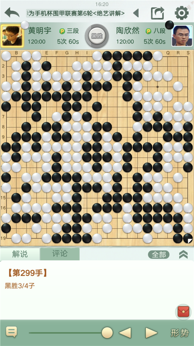 第三臺(tái),陶欣然執(zhí)黑對(duì)陣小將黃明宇。局勢(shì)幾經(jīng)反復(fù),幸運(yùn)3/4子獲勝。