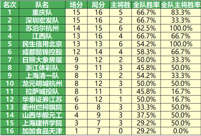 《2020年華為手機(jī)杯中國圍甲聯(lián)賽第六輪積分榜》