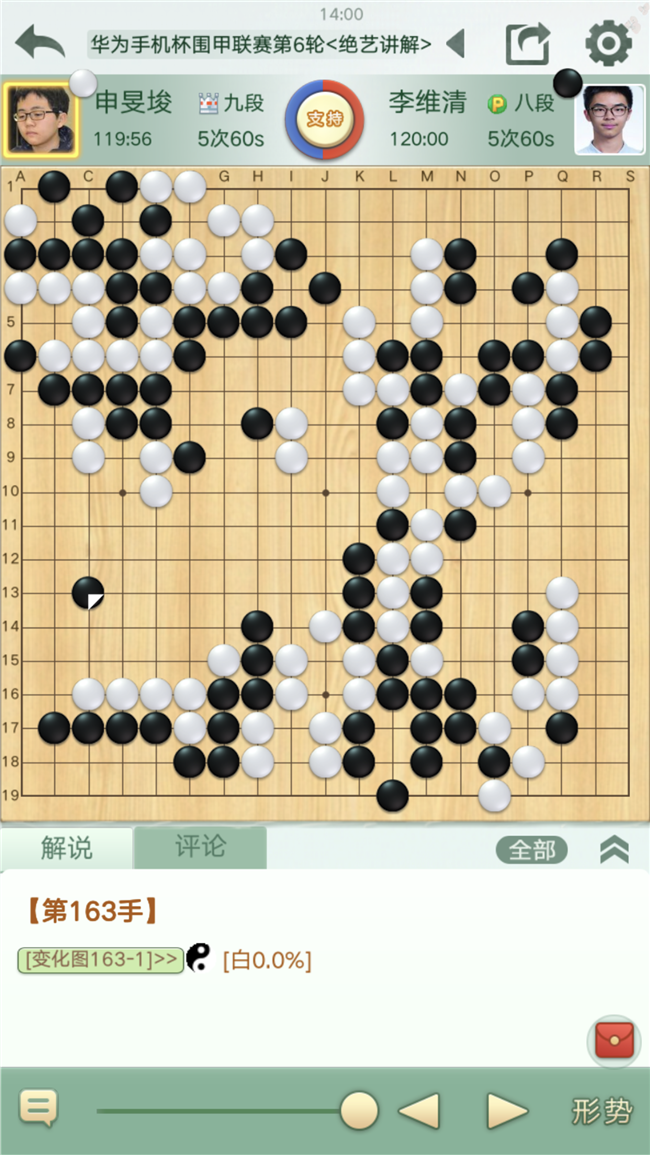 第二臺(tái),申旻俊主將對(duì)陣?yán)罹S清。右上作戰(zhàn)黑棋下出了一子解雙征的妙手,白棋應(yīng)對(duì)失誤大虧損。