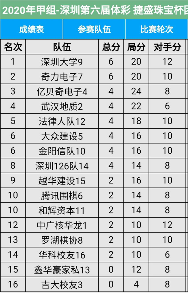 深圳市圍棋聯(lián)賽以其獨(dú)特的25D賽制,新穎的團(tuán)體對(duì)抗形式,旗鼓相當(dāng)?shù)膶?shí)力比拼,而深受圍棋愛(ài)好者的喜愛(ài),已然成為每年一度的市圍棋愛(ài)好者的盛會(huì)。本屆聯(lián)賽共有28支隊(duì)伍參賽,每支隊(duì)伍12人,領(lǐng)隊(duì)和教練各一至兩人,今年參賽人數(shù)約四百多人。其中,超級(jí)隊(duì)12支,進(jìn)行11輪單循環(huán)比賽,甲級(jí)隊(duì)16支進(jìn)行11輪積分循環(huán)賽。具體賽程安排是:今日開(kāi)賽后,連續(xù)四個(gè)周日,每周3場(chǎng)比賽,計(jì)劃在11月22日完成比賽。本屆比賽12支超級(jí)隊(duì)是:盛榮模具、東方薈隊(duì)、吉大隊(duì)、小明日酒、萬(wàn)景華隊(duì)、俊城建設(shè)、鹽田棋協(xié)、瑞珂瑪隊(duì)、兒童棋院、愛(ài)博科技、大華稅務(wù)、報(bào)業(yè)青春。16支甲級(jí)隊(duì)是:中廣核華龍、武漢地質(zhì)、吉大校友、億貝奇電子、大眾建設(shè)、騰訊圍棋、奇力電子、羅湖圍棋、深圳大學(xué)、金陽(yáng)信隊(duì)、和輝資本、法律人隊(duì)、鑫華豪家私、深圳126隊(duì)、越華建設(shè)、華科校友。大家濟(jì)濟(jì)一堂,通過(guò)手談增進(jìn)友誼,提高棋藝。本屆比賽超級(jí)組與甲級(jí)組實(shí)行升降制,將通過(guò)四個(gè)周日的比賽,分別決出前六名和三支升降的隊(duì)伍。