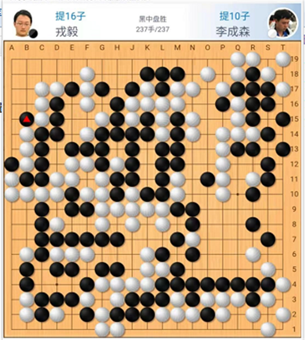 快棋臺(tái)由深圳隊(duì)的戎毅七段執(zhí)黑對(duì)陣天津隊(duì)的李成森五段。序盤平穩(wěn)過渡,進(jìn)入中盤時(shí)黑棋在白上方大空中試應(yīng)手,白棋最大程度強(qiáng)撐大空,留下隱患。在下方定型結(jié)束后,黑棋在白空中弈出巧手將白空打穿,取得領(lǐng)先。在劣勢(shì)情況下,白棋在爭(zhēng)搶官子時(shí)置中央大龍于不顧,黑棋攻殺白大龍順勢(shì)將白棋左下角吃掉,一舉獲勝。戎毅執(zhí)黑中盤勝李成森。