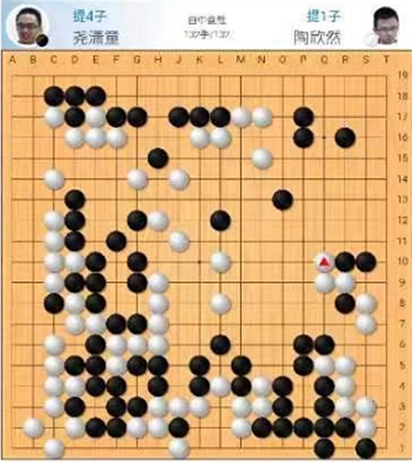 慢棋第四臺(tái)由深圳隊(duì)的陶欣然八段執(zhí)白對(duì)陣天津隊(duì)的堯?yàn)t童二段。雙方開局形成少見的新變化,白棋取得優(yōu)勢(shì)。之后白棋牢牢掌控局面,至132手兵不血刃快勝,陶欣然執(zhí)白中盤勝堯?yàn)t童。