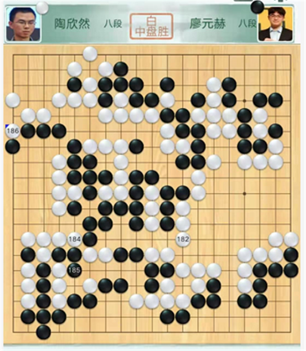 第四臺慢棋,由深圳隊陶欣然八段執(zhí)白對陣成都隊廖元赫八段。中央戰(zhàn)斗時候白棋選擇退讓,反倒形成打劫,黑棋劫勝后大幅領先。之后黑棋官子階段不夠冷靜細膩,幾處小虧損之后被白反超。黑棋看到局面危險更加沖動的選擇和白棋互相破空,結果又虧損導致差距越來越大。陶欣然執(zhí)白中盤勝廖元赫。