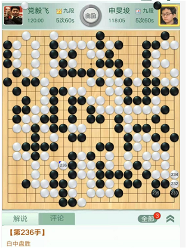 第一臺慢棋,由深圳隊的外援申旻埈九段執(zhí)黑對陣成都隊的世界冠軍黨毅飛九段。右下角白棋出現失誤,黑棋沒有抓住機會反而被白棋便宜不少。之后黑棋頑強追趕局面一度接近。但是官子階段黑棋始終沒有發(fā)現左上角官子便宜的小巧手,被白消除隱患后,白勝勢。申旻埈執(zhí)黑中盤負黨毅飛。